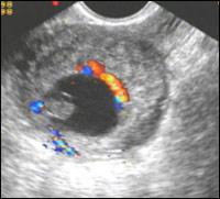 | Цветовая допплерография внематочной беременности Развивающаяся внематочная беременность. Цветовые пятна отражают кровообращение эмбриона (1)