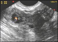 Обнаружение патологического образования в проекции придатков является наиболее точным из всех косвенных признаков. Данное образование представляет собой трубу с плодовместилещем. В тех случаях, когда имеется прогрессирующая трубная беременность малого срока, в просвете маточной трубы определяется полость амниона округло-овальной формы, внутри которой можно визуализировать желточный мешок в виде кольцевидной структуры. Особенностью визуализации плодного яйца в маточной трубе является хорошо определяемый хорион, который окружает полость амниона по периферии в виде ткани солидной структуры. Такая отчетливая визуализация хориона объясняется разной эхогенностью тканей. Если в полости матки трофобласт и эндометрий имеют одинаковые эхографические характеристики, то в просвете трубы, где слизистая очень тонкая, хорион хорошо определяется как зона повышенной эхогенности на гипоэхогенном фоне мышечного слоя стенки. Дополнительным эхогрфическим признаком является отсутствие связи выявленного образования с маткой и яичником, для чего помогает исследование имитации двуручного исследования. Применять этот прием следует очень осторожно, помня, что при форсированных движениях возможен разрыв трубы. Более щадящим методом, однако, менее надежным является глубокий вдох и выдох пациенткой, при котором происходит смещение внутренних органов.