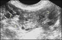 | Эхокартина внематочной беременности Плодовместилище (1)левый яичник (2) венозное сплетение латеральней маточного угла (3) кишечник (4)
