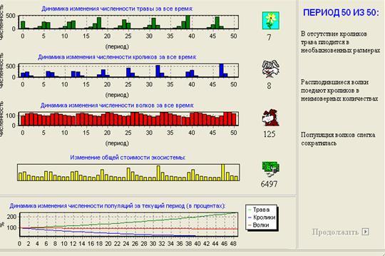 При выполнении данного задания была замечена одна закономерность: при изменении одного из параметров (плодовитость и естественную смертность кроликов, ловкость и естественную смертность волков, урожайность и питательность травы) экосистема выходила из состояния равновесия и через определенные периоды прекращала свое существование.