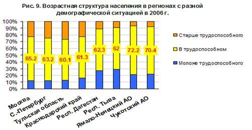 Процесс старения населения страны выразится в ухудшении соотношения возрастных групп моложе и старше трудоспособного возраста. Изменение соотношения в трудовой структуре населения приведет к тому, что численность выходящих за пределы трудоспособного возраста к 2015 году будет почти в два раза превышать численность вступающих в трудоспособный возраст.