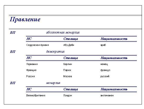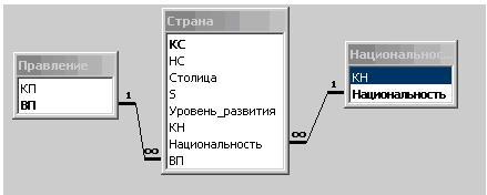 Таблица “Правление ” связана с таблицей “Страна ” с помощью поля “ВП ”, тип связи – один ко многим (одной записи в таблице “Правление ” может соответствовать несколько записей в таблице “Страна” ). Таблица “Национальность” связана с таблицей “Страна” с помощью поля “Национальность”, тип связи – один ко многим (одной записи в таблице “Национальность ” может соответствовать несколько записей в таблице “Страна” ).