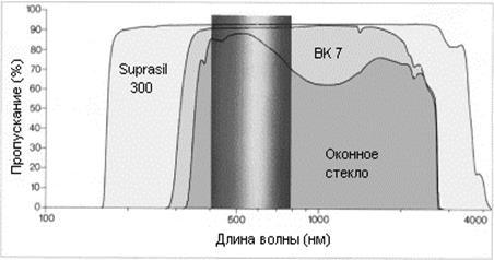 С, что в 4 раза больше, чем для обычного стекла). Спектр оптического пропускания синтетического кварцевого стекла Suprasil 300, оптического стекла BK 7 и обычного стекла представлены на рис.5. Спектр видимого света лежит примерно в пределах от 380 нм до 760 нм.