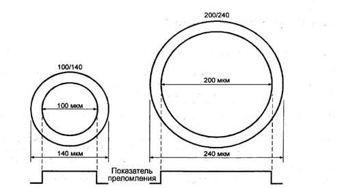 Типы и размеры волокон приведены на рисунке 1. Каждое волокно состоит из сердцевины и оболочки с разными показателями преломления. Сердцевина, по которой происходит распространение светового сигнала, изготавливается из оптически более плотного материала. При обозначении волокна указываются через дробь значения диаметров сердцевины и оболочки. Волокна отличаются диаметром сердцевины и оболочки, а также профилем показателя преломления сердцевины. У многомодового градиентного волокна и одномодового волокна со смещенной дисперсией показатель преломления сердцевины зависит от радиуса. Такой более сложный профиль делается для улучшения технических характеристик или для достижения специальных характеристик волокна.