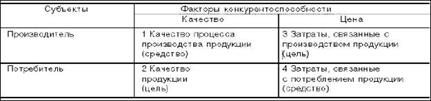 С точки зрения производителя полезность продукции определяется затратно-ценовыми факторами. В долгосрочной перспективе целью действий любого производителя является достижение максимальной разницы между ценой реализации продукции и собственными затратами на ее производство (квадрант 3). В связи с этим первостепенной задачей для производителя является формирование в сознании потребителя мнения о высокой степени полезности данной продукции. Качественный уровень процесса производства продукции (квадрант 1), выражающийся через производственно-технологические показатели и воплощенный в качество продукции, обеспечивает удовлетворение потребности производителя и выступает средством достижения цели — получения прибыли.