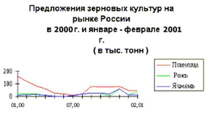 Урожай пшеницы в ЕС составил почти 100 млн. тонн , США - более 62 , Канаде - свыше 30 млн. тонн . Значительные объемы зерна на экспорт предлагают ЕС (около 18 млн. тонн) , Канада (почти 20 млн. тонн), Австралия ( более 13 млн. тонн). С учетом изложенного положения на внутреннем рынке зерна России и на мировом рынке можно сделать вывод о том , что это создало определенные предпосылки для увеличения предложений на рынке зерна . Если говорить о внутреннем рынке , то особенно предложение зерна на продажу возросло начиная с августа 2000 года , т.е. с поступлением зерна нового урожая . Например , по данным Минсельхозпрода РФ предложения регионов на вывоз пшеницы в августе - декабре 2000 года составляли около 75 тыс. тонн ежемесячно . Львиную долю в этих предложениях занимал Ставропольский край (45 - 50 тыс. тонн). По ржи предложения колебались в пределах 10 - 20 тыс. тонн , где ведущее место занимала Республика Марий - Эл (2000 тонн). По ячменю предложения на вывоз из регионов - производителей особенно возросли в ноябре - декабре 2000 года ( до 50 - 60 тыс. тонн) , в основном за счет Тульской области ( 40 тыс. тонн ) . Аналогичное положение отмечается по овсу , где за этот же период предложения возросли до 25 - 30 тыс. тонн, особенно по Алтайскому краю (20 тыс. тонн). По мере реализации зерна отмечается снижение предложений его на рынок, но в целом положение остается стабильным , т.к. вслед