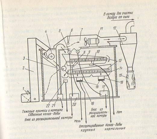 Для производства шоколада и препарированного какао-порошка технологический процесс может быть представлен аппаратурно-технологической схемой [1]. Какао-бобы загружают в приемную воронку нории Шнеком они подаются на весы а затем ленточным конвейером через загрузочную норию — в очистительно-сортировочную машину [2], где отделяются от механических примесей и сортируются по размерам. Затем какао-бобы подаются для термической обработки в шахтную сушилку, которая, кроме зоны обжаривания, имеет и зону охлаждения. Обжаренные и охлажденные какао-бобы из промежуточного сборника поступают в дробильно-сортировочную машину Здесь они измельчаются и разделяются на какао-крупку и оболочку. Полученная какао-крупка подается в бункер и в размольный агрегат Полученная суспензия (какао тертое) поступает в приемный сборник, откуда насосом перекачивается в сборники на две линии переработки: для получения какао-масла и шоколадной массы.