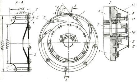ной ванной для подшипников. Максимальная производительность вентилятора достигается при отрицательных углах установки лопаток, когда поток подкручивается навстречу вращению колеса. Режим работы регулируется изменением угла установки закрылков лопаток рабочего колеса.