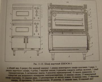 состоит из двух однотипных унифицированных жарочных секций (камер) установленных на инвентарных шкафу-подставке с регулируемыми по высоте ножками. Каждая секция состоит из внутреннего и наружного коробов, пространство между которыми заполнено теплоизоляционными материалами.