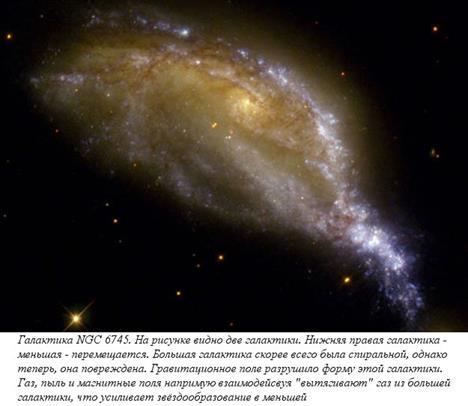 того, что она не успела принять правильной формы из-за малой плотности в ней материи или из-за молодого возраста. Есть и другая версия: галактика может стать неправильной в следствии искажения формы в результате взаимодействия с другой галактикой (см. рис. поврежденной галактики NGC6745).