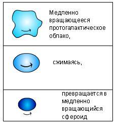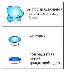 Наблюдаемые свойства галактических дисков находят естественное объяснение в созданных на ЭВМ моделях быстро вращающихся звездных систем. Рассмотрим описанную выше эллиптическую галактику. Если ее протогалактическому газовому облаку придать быстрое вращение еще до образования большинства звезд, то облако приобретет плоскую форму, и распределение звезд будет напоминать диск спиральной галактики. Таким образом, оказывается, что основное структурное отличие эллиптических галактик от спиральных состоит в скорости исходного вращения.