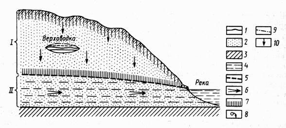 1- почвенные и капиллярно-подвешенные воды, 2- песчаные водопроницаемые породы, 3- водонепроницаемые породы, 4- грунтовые воды, 5- уровень грунтовых вод, 6- направление движения грунтовых вод, 7- капиллярно-поднятая вода, 8- нисходящий источник, 9- уровень верховодки, 10- направление инфильтрующихся вод (Короновский, Якушова, 1991)