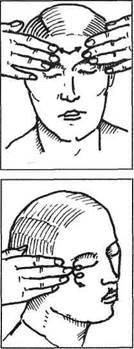 Поглаживание лба II—Vпальцами идет от середины лба к вискам. Массирование — вдоль скуловой дуги к вискам и от углов рта к вискам. Затем массируется подбородок; направление массажных движений — от подбородка вдоль нижней челюсти и вверх к ушам. Лоб массируется от переносицы до начала волося ного покрова одной или попеременно двумя руками. Средним и безымянным пальцами обеих рук проводится поглаживание у внутреннего угла глаза к брови. Затем глаза закрываются, и производится поглаживание глаз от внутреннего угла к виску; движения очень осторожные. Приемы растирания выполняются в области лба, подбородка, носа, щечных мышц, круговой мышцы рта. Разминание делается в области подбородка, щек, лба; вибрация — по точкам выхода тройничного и лицевого нервов подушечкой среднего пальца. Приемы растирания и разминания применяются также при повреждениях кожи и мышц лица, для ликвидации рубцов, выпотов, инфильтратов и пр., а вибрация — при различных заболеваниях нервов.