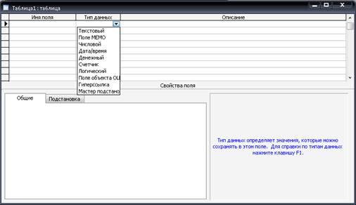 Для определения поля в окне Таблица заполняются поля «Имя поля», «Тип данных», «Описание» — краткий комментарий — а также свойства поля в разделе «Свойства поля». На вкладке «Общие» представлены строки свойств поля, в том числе максимальный размер, подпись, которая выводится в заголовке столбца, значение по умолчанию и другие. На вкладке «Подстановка» выбирается тип элемента управления: поле, список или поле со списком.