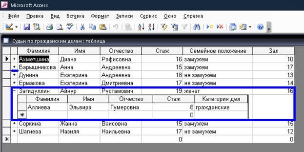 Щелкаем на знаке «плюс» записи для «Загидуллин Айнур Рустамович», откроется вложенная таблица, содержащая те записи таблицы «Помощники судей» значение поля Код которых равно величине одноименного поля записи для «Загидуллин Айнур Рустамович».