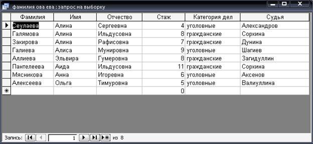 Рассмотрим форму создания запроса на примере таблицы «Судьи по гражданским делам» и «Судьи по уголовным делам». В окне запроса вводим следующее название полей: «Фамилия». В условии отбора для поля «Фамилия» вводим «=-ова, -ева».