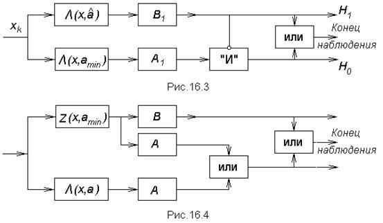С другой стороны, процедуру проверки гипотезы целесообразно строить на основе статистики, зависящей от оценки неизвестного параметра . Условие прекращения наблюдения при этом состоит в выходе любой из статистик: или за соответствующий решающий порог. При одновременном пересечении обоих порогов приоритет принадлежит решению в пользу , т.к. гипотеза в таком обнаружителе предполагает лишь отсутствие сигнала с параметром , а альтернатива наличие любого сигнала, в том числе и с .