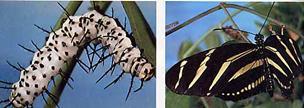 Как видно из представленных на этих страницах снимков, обнаружить какое-либо сходство между неуклюжими гусеницами и яркими взрослыми бабочками совершенно невозможно. Покрытая шипами пятнистая личинка (прямо внизу) не дает никакого намека на элегантную полосатую нимфалиду, которой она станет во взрослом возрасте.