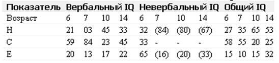 Сравнивая возрастную динамику показателей наследуемости общего интеллекта в этих работах с данными нашего исследования (таблица 6), следует обратить внимание прежде всего на относительно низкие показатели наследуемости: у нас – в 7 лет, в Луизвильском исследовании – в 8 и 9 лет.