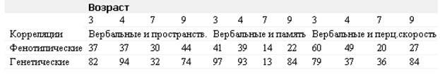 Отчетливо видно, что в 7 лет корреляции вербальных характеристик с пространственными характеристиками, памятью и перцептивной скоростью оказываются ниже, чем в трех других возрастах. Более того, снижение генетических корреляций оказывается существеннее, чем снижение фенотипических корреляций. Автор интерпретирует этот результат с точки зрения увеличения специфики когнитивных процессов с возрастом, хотя и отмечает, что в 9 лет специфичность когнитивных характеристик опять снижается.