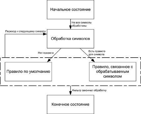 Эти правила достаточно стандартны для практически любой системы, где используется работа с текстом. Существует множество вариантов их реализации. Самый распространенный – при помощи уже упоминавшихся регулярных выражений [5]. При этом строится по одному или несколько выражений на каждое правило, после чего они в определенном порядке применяются к строке. Выполнение каждого регулярного выражения – это один проход по строке, следовательно, таких прогонов будет огромное количество. Правда, большая часть из них будет пустой, но даже они занимают какое-то время.
