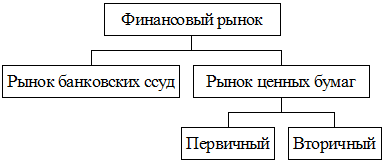 Рынок ценных бумаг входит как элемент в систему финансового рынка и, в свою очередь, подразделяется на первичный и вторичный, а вторичный – на биржевой и внебиржевой (рис. 1).Рынок банковских ссуд