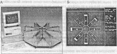А — автоматизированный радиальный лабиринт с закрытыми рукавами; Б — изображение лабиринта на экране монитора.