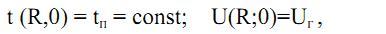 В процессе контактного прогрева металла температуру поверхности материала в первом приближении можно принять равной температуре нагревательных элементов, а процесс массообмена характеризуется разностью парциальных давлений паров удаляемой влаги в среде и над поверхностью влажного материала. Тогда граничные условия для решения дифференциальных уравнений (4) и (5) могут быть записаны в следующем виде