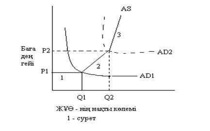 ) және, экономика жалпы ұсыным қисығының аралық (2) немесе классикалық (3) үзіндісінде болса, бұл баға деңгейін арттырады (Р1