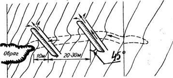 Рис.1 Схема распылителя полевого стока. Борозды проводят под углом 45° к стоку с отваливанием пласта вниз по склону