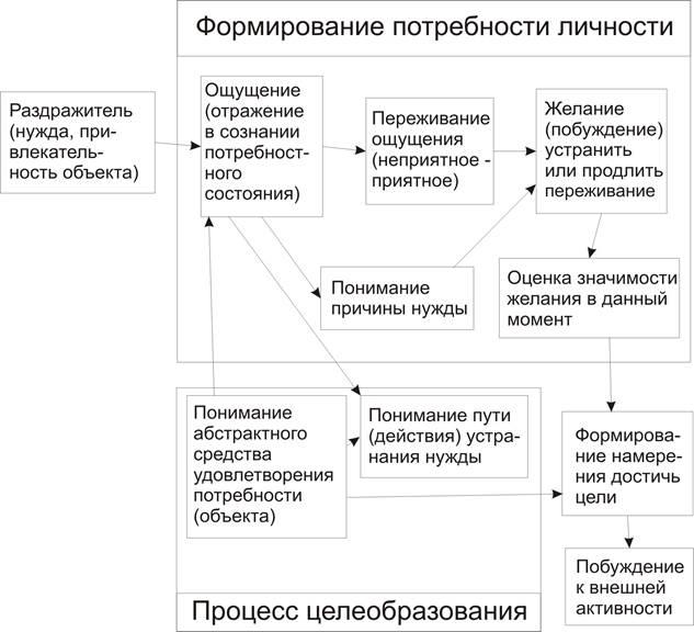 Таким образом. потребность как аккумулятор, заряжает энергией всю дальнейшую поисковую активность человека. На этом этапе предмет удовлетворения потребности выступает в качестве обобщенного образа, понятия (мне нужна пища, жидкость), т. е. сначала появляется абстрактная цель, без ее конкретизации (что поесть, что попить) и без продумывания путей ее нахождения. При этом, чем сильнее выражена потребность, тем менее специфичен объект ее удовлетворения: потребность удовлетворяется тем, что подвернется. Появление абстрактной цели ведет к формированию побуждения, к поиску конкретного предмета удовлетворения потребности. Появление этого побуждения означает конец формирования первичного (абстрактного) мотива (в структуру которого входит и потребность и цель) и побуждение к поиску конкретной цели, т. е. к проявлению человеком какой-то активности (см. приложение 2).
