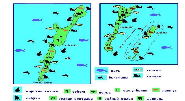 Разнообразен животный мир Курил. Из промысловых зверей обитают медведь, росомаха, лисы, соболь, заяц, северный олень, белка, бурундук, горностай, выдра.