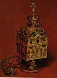 Потир 1595 года, принадлежавший соловецкому игумену Якову, несомненно, был исполнен мастером, тяготевшим к новгородской школе прикладного искусства. Золоченая конусообразная чаша имеет восемь клейм в виде киотцев с резным поясным изображением Деисуса. Фигуры святых из деисусного чина, несмотря на небольшие размеры, производят впечатление величавой торжественности и монументальности. Широкая полоса по венцу чаши с традиционной литургической надписью по характеру начертания букв -утолщенных, свободно отстоящих друг от друга - имеет немало аналогий среди новгородских памятников прикладного искусства. Близка к новгородской культуре янтарная панагия XVI века в серебряной золоченой сканой оправе. Восьмиугольная с вогнутыми сторонами оправа украшена гладкими спиралевидными крупными завитками и мелкими кружочками витой проволоки. Возможно, панагия была сделана в самом монастыре мастером, хорошо знакомым с приемами работы и орнаментальными мотивами, использовавшимися новгородцами, о чем свидетельствуют плавный ритм сканого узора и четкость рисунка, свойственные новгородским сканым изделиям.