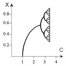 . Это область стационарных решений. Затем в диапазоне 3 < с < 3.57 появляются бифуркации, разветвление кривых на две. Численность популяции колеблется между двумя значениями, лежащими на этих ветвях. Сначала популяция резко возрастает, на следующий год возникает перенаселенность и через год численность снова становится малой. Далее происходит перекрывание областей различных решений, и поведение системы становится хаотическим. Динамические переменные X