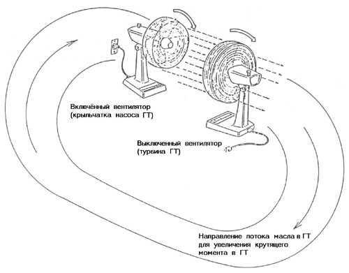 Насосное колесо механически связано с двигателем. В качестве выключенного вентилятора (турбины) выступает турбинное колесо, соединённое через шлицы с валом АКП. Подобно вентилятору - насосу, крыльчатка насосного колеса ГТ, вращаясь, создаёт поток, только уже не воздуха, а жидкости (масла). Поток масла, как и в случае с вентилятором - турбиной, заставляет вращаться турбинное колесо ГТ. В данном случае ГТ работает как обыкновенная гидромуфта, лишь передавая посредством жидкости крутящий момент от двигателя на вал АКП, не увеличивая его. Увеличение оборотов двигателя не приводит к сколь - ни будь существенному увеличению передаваемого крутящего момента. Снова возвратимся к иллюстрации с вентиляторами. Поток воздуха, крутящий лопатки вентилятора - турбины, рассеивается впустую в пространстве. Если же этот поток, сохраняющий значительную остаточную энергию, направить снова к вентилятору - насосу, он начнёт вращаться быстрее, создавая более мощный поток воздуха, направленный к вентилятору - турбине. Тот, соответственно, тоже начнёт вращаться быстрее. Это явление известно как преобразование (увеличение) крутящего момента.