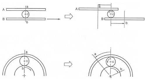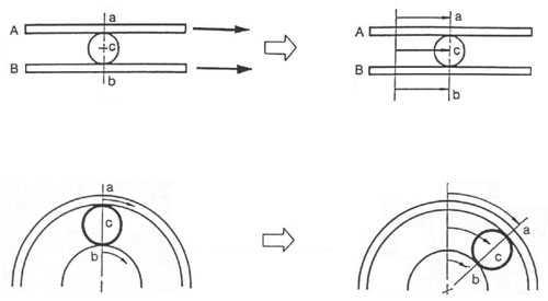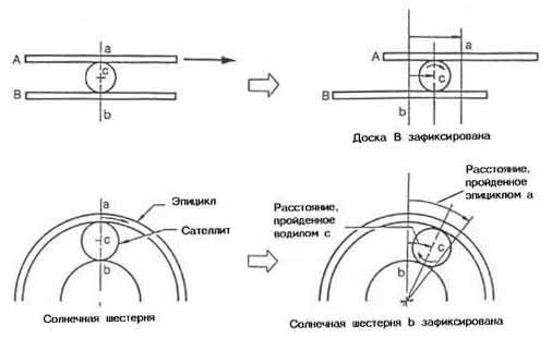 Рассмотрим простой пример. На рис. 8 показан шарик С между досками А и В. Доска В зафиксирована неподвижно, а доска А двигается в направлении, показанном стрелкой. В этом случае шарик с двигается в том же направлении, что и доска А, только медленнее её. Если применить этот пример к планетарному ряду, то в качестве доски А выступит эпицикл, в качестве доски В - солнечная шестерня и в качестве шарика С - сателлиты. Если зафиксировать солнечную шестерню и повернуть эпицикл в направлении стрелки, сателлит будет вращаться в том же направлении, что и эпицикл. Однако, как и в случае с досками и шариком, сателлит вращается медленнее, чем эпицикл. Такое соотношение скоростей вращения эпицикла и сателлитов в планетарном ряду АКП осуществляется на второй передаче