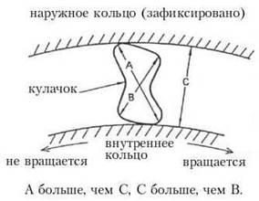 Когда внутреннее кольцо вращается по часовой стрелке, оно проскальзывает через кулачок (см. рис. 16). Когда же внутреннее кольцо пытается вращаться против часовой стрелки, оно поднимает кулачок и он, заклиниваясь, не даёт кольцу возможности вращаться в этом направлении.