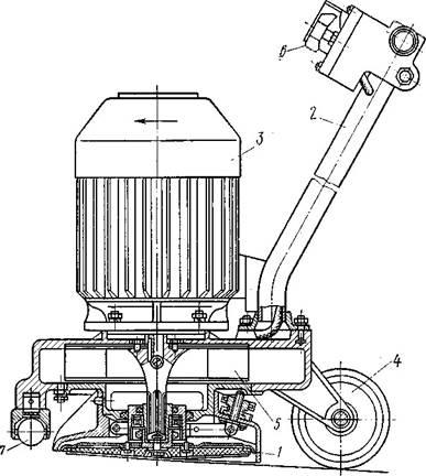 (обычно два). Барабан является одновременно обращенным ротором электродвигателя. Статор электродвигателя установлен на валу, закрепленном в боковых крышках корпуса. Кроме ножей на барабане закреплена крыльчатка — вентилятор для отбрасывания стружки в сторону. Ходовая часть машины состоит из одного переднего / и двух задних роликов 4.