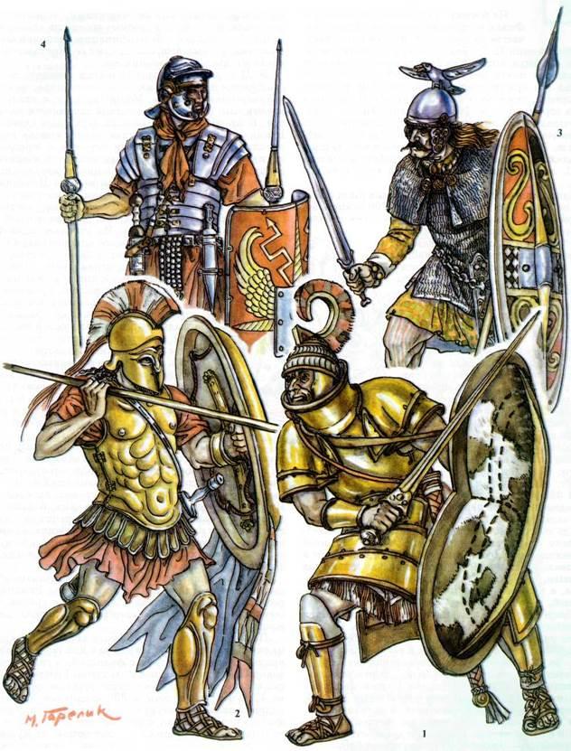 В III в. до н. э. центры развития военного дела смещаются на периферию эллинского мира, на его «варварские» окраины. Мощным, хотя и кратковременным, был всплеск военной активности кельтов. В их обществе произошли серьёзные сдвиги. Единая в прошлом священная власть короля разделилась: власть над душами перешла к жрецам-друидам, зато большую свободу получили военные вожди. Резкое увеличение численности кельтов подвигло их на завоевания в Британии и Испании, Центральной Европе и Малой Азии. Воинственный энтузиазм кельтов-галлов переходил в неистовство: среди них были безумцы, нагими рвущиеся в бой в первом ряду. Их успехам содействовало надёжное конское снаряжение и оружие: удобные, но строгие уздечки, оригинальные сёдла, длинные мечи и широкие наконечники копий из железа, бронзовые и железные остроконечные шлемы, обтянутые кожей большие овальные щиты с выпуклой железной пластиной в центре. Эпохальным изобретением кельтов оказалась кольчуга из железных, соединённых между собой колечек. Надёжная и лёгкая, хотя и очень трудоёмкая в изготовлении, она быстро завоевала симпатии воинов и на Востоке, и на Западе. Особенно в Италии...