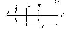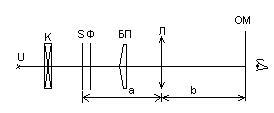 состоит из осветителя И, К, раздвижной щели S, светофильтров Ф, бипризмы Френеля БП, окулярного микрометра ОМ, в фокальной плоскости которого наблюдается интерференционная картина. Для определения расстояния l между мнимыми изображениями щели дополнительно применяется собирающая линза Л (рис. 4б, в) с фокусным расстоянием 10-15 см. Все приборы располагаются на оптической скамье в держателях, снабженных указателями для отсчетов их положений. Приборы могут перемещаться в держателях вверх и вниз и закрепляться в требуемом положении.