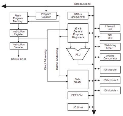 З метою досягнення максимальної продуктивності і паралельності виконання операцій в AVR-МК використовується Гарвардська архітектура з роздільними пам'яттю і шинами програм і даних. Команди в пам'яті програм виконуються з однорівневою конвеєризацією. У процесі виконання однієї інструкції наступна попередньо зчитується з пам'яті програм. Дана концепція дозволяє виконувати одну інструкцію за один машинний цикл.