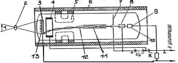 Изображение 1 через объектив 2 проектируется па полупрозрачную фотомозаику со стороны сигнальной пластины 13, при этом элементы мозаики будут излучать электроны пропорционально их освещенности и заряжаться положительно. Вылетевшие электроны фокусируются катушкой 6, через управляющий электрод 11 попадают в ускоряющее поле коллектора и полностью оседают на коллекторе 7, что устраняет возможность возвращения фотоэлектронов на мозаику. Коммутирующий электронный луч компенсирует положительные заряды мишени и доводит потенциал всех ее точек до равновесного значения. Электроны коммутирующего луча, оставшиеся от компенсации положительных зарядов, возвращаются на коллектор. Таким образом, луч оказывается промодулированным по плотности и на нагрузочном резисторе выделяется телевизионный сигнал.