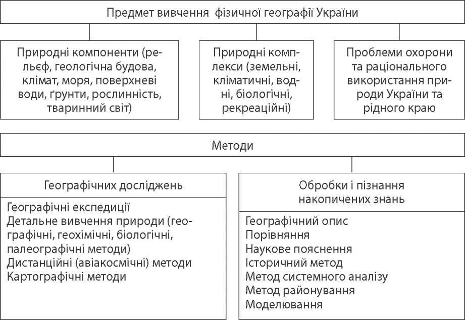 | | Рівновеликі (рівноплощинні) | Рівнокутні | Довільні | | не спотворюють кути і форми об'єктів земної поверхні, але спотворюють площу і довжи- ну ліній; використовуються для створення штурманських карт, тому що є зручними: лінія, яка перетинає всі ме- ридіани під одним кутом, зображується прямою | спотворюють і кути, і лінії, і площі, і фігури, але значно менше, ніж рівно- великі та рівнокутні проекції; використо- вується для створен- ня карт світу, мате- риків та їх частин | | правильно пе- редають спів- відношення площ; вико- ристовуються для створення карт земельних угідь, лісів | географічні дослідження на території України До середини XVIII століття свідчення про природу України надавали мандрівники і літописці. Перші письмові відомості про території України є джерелами не тільки географічних, але й історичних знань. Цінні геогра- фічні відомості містяться у праці «Історія» давньогрецького вченого Геродо- та. В ній вказуються тодішні назви річок і місцевостей на території України. Подібні відомості наводять у своїх працях і давньоримські вчені Страбон, Клавдій Птоломей, Пліній Старший. У Київському літописі 1187 року вперше згадується географічна назва нашої землі — Україна. Надзвичайно цікаві відомості з географії України містить книга французького інженера Г. Л. де Боплана «Опис України», у якій він навів характеристику Києва, описав запорожців, склав детальні карти українських земель тощо. З XVIII століття почалися наукові дослідження території України. Для пізнання природних умов і ресурсів України мали значення відкриття Г. Капустіним родовищ кам'яного вугілля в Донбасі (1721 p.), вивчення ро- довищ залізних руд у долині р. Саксагані академіком Петербурзької академії наук і мистецтв В. Зуєвим (1781—1782 pp.) і його ж опис природних умов, населення і господарства Лівобережної України і Причорномор'я. У 1793— 1794 pp. експедиції академіків П. Палласа та І. Гюльденштедта вивчали ґрунти, рослинність, тваринний світ України. Значний внесок у вивчення географії України зробили вчені Київського, Львівського, Одеського, Харківського університетів. У 1873 р. у Києві був ство- рений Південно-західний відділ Російського географічного товариства, одним із засновників і керівником якого був видатний етнограф і географ П. Чубинський (відомий і як автор тексту національного гімну «Ще не вмерла України...»). Ре- зультати досліджень його експедицій були видані під назвою «Роботи етногра- фічно-статистичної експедиції в Західно-російський край» (1872—1878 pp.). Велике значення для розвитку географії України мало створення в уні- верситетах кафедр географії (з 30-х pp. XIX ст.). Кафедру фізичної географії відкрив у Харківському університеті проф. А. Краснов (1889 p.). У 1918 р. у Києві була заснована Академія наук України, учені якої дослі- джували природні умови і ресурси, господарство і населення держави. Заснов- 8 ник і перший президент Академії наук України — академік В. Вернадський (1863—1945 pp.). Одним із засновників фізичної географії в Україні був академік С. Руд- ницький (1877—1937 рр.). Йому належать наукові праці з геоморфології, історичної і соціально-економічної географії, картографії, краєзнавства, фізичної географії України. У 1927 р. він заснував у Харкові (тоді столиця України) Український науково-дослідний інститут географії і картографії, провів експедиційні дослідження 