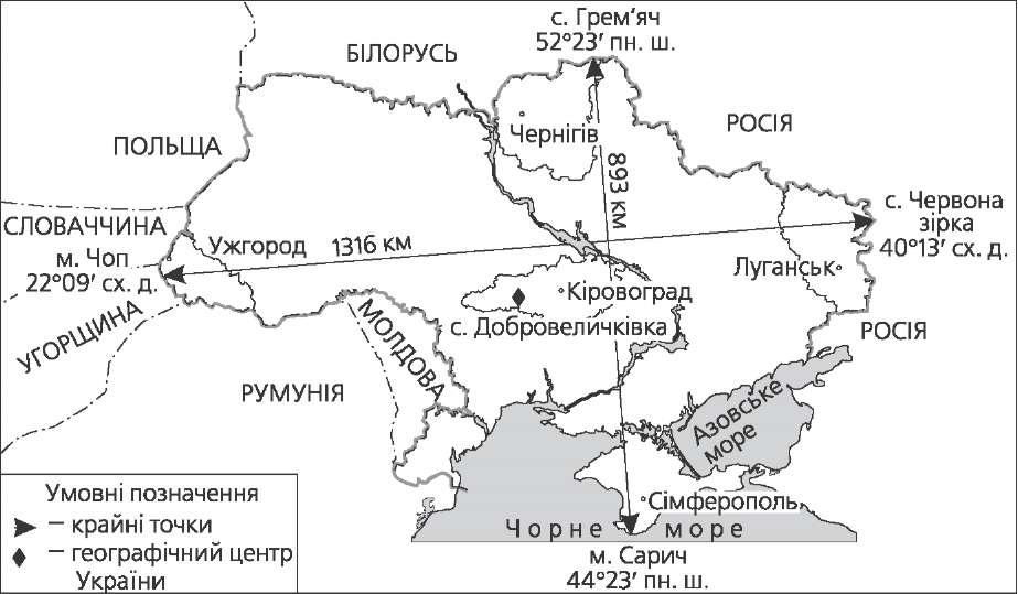 Україна має вихід до Чорного та Азовського морів і є країною чорномор- ського регіону. Це має важливе значення, бо відкриває можливість прокла- дання транзитного шляху природних ресурсів (зокрема нафти) з азіатського регіону через Чорне море територією нашої держави до Європи. Вихід до мо- рів дає також можливість використання їх як джерела природних ресурсів та транспортних шляхів. Важливе значення для України має переважання на її території рівнинно- го рельєфу, що позитивно впливає на розвиток господарства. Наявність агрокліматичних та ґрунтових ресурсів обумовили розвиток практично на всій території держави сільського господарства. На території України (переважно у північній частині) поширені широко- листі й мішані лісові та лісостепові ландшафти, що дає змогу успішно розви- ватись лісовому господарству. Значна частина території України (за виключенням південно-східних районів) достатньо забезпечена водними ресурсами. Головна водна артерія України — Дніпро є джерелом для виробництва електроенергії (ГЕС на Дніп- рі), місцем промислового рибальства та транспортною магістраллю. Міжна- родне значення має для України судноплавство по Дунаю. Геополітичне положення України Геополітичне положення (ГПП) країни — це місце країни на політичній карті світу відносно до центрів економічного та політичного впливу. | План | Характеристика | Оцінка: позитивна «+», негативна «-» | | Місце країни на політичній карті світу | Розташована у центрально-східній части- ні Європи | + | | Розташуван- ня відносно економічних центрів і транс- портних осей інтеграційних угруповань | Можливість інтеграції в міжнародні сис- теми кооперативної безпеки в Європі | + | | Спільний кордон з країнами Організації Північноатлантичного договору — Поль- щею та Угорщиною, близьке сусідство з Туреччиною | + | | Спільний кордон з країнами Євросоюзу | + | | Віддаленість від основних економічних центрів світу | - | | Участь у військово- політичних та політико- економічних організаціях | Активна участь у миротворчій діяльності | + | | Членство в Організації Об'єднаних На- цій, Співдружності незалежних держав, Європейському банку реконструкції та роз- витку, Міжнародному валютному фонді, Парламентській асамблеї Чорноморського економічного співробітництва, Раді Євро- пи, Центральноєвропейській ініціативі, Європейському Економічному Просторі | + | 55