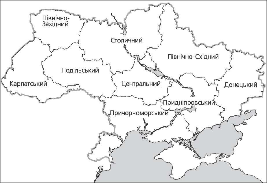 видів продукції, наприклад: видобутку залізної, манганової руди й вугілля; виробництва сталі, сульфатної кислоти, мінеральних добрив, цементу; ви- рощування цукрового буряку, соняшнику й картоплі. У цілому пріоритетними для України є зв'язки з Російською Федерацією, Білоруссю, Казахстаном, країнами Центральної і Східної Європи, а також з економічно розвинутими країнами — США, Японією, Німеччиною, Фран- цією, Великою Британією, Канадою, Італією та ін. Структура зовнішньої торгівлі Експорт — вивезення товарів із країни, надання іноземному партнерові послуг виробничого і споживчого характеру Імпорт — ввезення до країни товарів, технологій, капіталів, отримання послуг виробничого або споживчого характеру Експорт (січень—листопад 2003 р. - 20679,4 млн дол. США)  Імпорт (січень-листопад 2003 p. - 20344,3 млн дол. США) Умовні позначення Щ - країни СНД ЦЦ - інші країни Чорні метали і вироби з них (39 %), сиро- вина, напівфабрикати, товари широкого вжитку за демпінговими цінами  Газ, нафта, нафтопродукти, деревина, бок- сити, товари легкої промисловості, авто- мобілі, засоби зв'язку, радіоелектроніка Торгове сальдо — різниця між експортом та імпортом товарів і послуг. розділ iv. територіальний поділ України Економіко-географічний поділ України Територіальний поділ праці — поділ праці на основі спеціалізації окремих територій країни. Спеціалізація території залежить: 1) від наявності при- родних умов і ресурсів, які впливають на розвиток господарства; 2) наявності та кваліфікації трудових ресурсів; 3) особливостей економіко-географічного положення; 4) історичних передумов розвитку території; 5) необхідності до- тримання державних інтересів. Економічний район — це значна територія країни, що відрізняється від інших особливостями історичного розвитку, економіко-географічного по- ложення, природними і трудовими ресурсами, спеціалізацією господарства. Основним у визначенні економічного району є принцип економічної заверше- ності. Він дає можливість передбачати напрямки ефективного господарювання з найменшими витратами. При цьому райони спеціалізуються саме на тих га- лузях, які за даних умов можуть розвиватися найбільш ефективно. Економічні 88