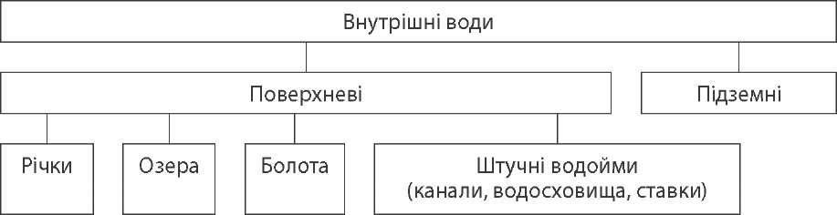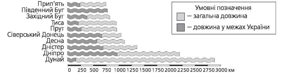 Території України притаманний перехідний до континентального режим атмосферних опадів з максимумом випадання влітку і мінімумом узимку. Спостерігається поступове зменшення річної кількості опадів із заходу і півні- чного заходу на південний схід і південь (від 550—650 мм до 300—350 мм). Тільки на Південному березі Криму спостерігається середземноморський субтропічний тип річного режиму опадів: максимум узимку, мінімум — уліт- ку. Максимальна річна кількість опадів спостерігається в Українських Кар- патах — до 1500—2000 мм. Для визначення забезпеченості території вологою використовують коефі- цієнт зволоження Кзв — відношення річної кількості опадів О до випарову- вання U. Кзв = 1 — достатнє зволоження, Кзв > 1 — надмірне , Кзв < 1 — не- достанє. В Україні чітко виражена зміна сезонів протягом року. Кліматичні сезони на території України | Зима | Весна | Літо | Осінь | | Температура повітря нижча 0 °С, трива- лість 75—130 днів, помірно м'яка на заході, прохолодна на південному сході й сході | Температура повітря від 0 °С до +15 °С, тривалість 50—100 днів, погода не- стійка | Температура повітря пере- вищує +15 °С, тривалість 100—165 днів, тепле, макси- мум опадів | Температура повіт- ря від +15 °С до 0 °С, тривалість 65—100 днів, не- стійка погода, зростання цикліч- ної діяльності | Кліматичні ресурси — це невичерпні природні ресурси, які включають сонячну енергію, вологу й енергію вітру. Кліматичні умови, які враховуються у сільському господарстві (трива- лість вегетаційного періоду, коефіцієнт зволоження тощо), називаються агрокліматичними. Кліматичні умови, які сприяють лікуванню й відпочинку людей, склада- ють рекреаційні кліматичні ресурси (Крим, Карпати тощо). внутрішні води  Провідна роль у загальному обігу вологи належить річкам. В Україні на- лічується більш як 4 тис. річок завдовжки понад 10 км, з них 117 — понад 100 км. Більшість річок належить до басейнів Чорного та Азовського морів і лише Західний Буг та Сян — до Балтійського басейну. Річки є важливими транспортними шляхами, джерелом одержання електроенергії. 21 | Тип | Умови утворення | Місцезнаходження, приклади | | Заплавні (озе- ра-стариці) | У старицях і притера- сових зниженнях | Повсюди, найчастіше — у доли- нах річок Полісся | | Загатні | Перекриття гірських річок загатами (зсува- ми, завалами) | Українські Карпати (Синевир) | | Лиманні | Опускання суходолу і затоплення морем гирл річок | Лимани Чорного та Азовського морів (Ялпуг, Сасик (Кундук), Ка- гул, Шагани, Сасик, Катлабух) | | Залишкові | Морські затоки, які відокремились у період підняття узбережжя | Перекопські озера, Саки, Дон- узлав | | Льодовикові | У льодовикових заглиб- леннях (карах) | Озера Карпат | | Вулканічні | У кратерах згаслих вулканів | Озера Закарпаття | | Карстові | У заглибинах розчине- них водою гірських по- рід (вапняків, крейди, солей) | Донбас (Слов'янські озера), Кримські гори (Караголь), Шацькі озера | 22 У розрахунку на одного жителя водозабезпеченість на заході України май- же в 7 разів вища, ніж на півдні, і в 3 рази вища, ніж на сході. Найбільші річки України З-поміж природних водойм провідне місце в Україні належить озерам і лиманам. Лиман — це витягнута мілководна затока, що утворюється від затоплення морем пригирлової частини річкової долини або балки. Лимани бувають відкриті, що сполучені з морем, і закриті — відокремлені від моря. Вони поширені