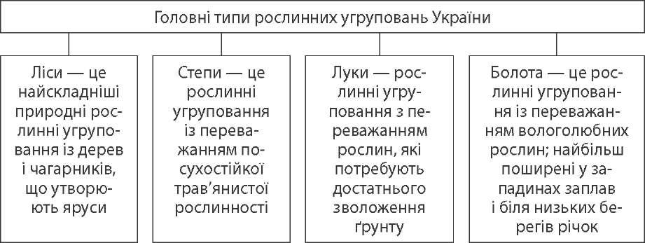 рослинний покрив Рослинний світ України відрізняється великою різноманітністю видо- вого складу. Із 300—350 тис. видів вищих рослин планети в Україні зростає 25 тис. Це 80 видів дерев, 280 видів чагарників, до тисячі видів однолітніх трав. Особливе значення мають ендемічні, а також рідкісні й зникаючі види рослин (понад 1000). Ними багаті Кримські гори і Карпати. Природна рослинність збереглася лише на 25 % території України. Господарська ді- яльність населення призвела до істотних змін рослинного покриву країни. Так, площа лісів скоротилася в 5 разів і зараз складає трохи більше 14 %. Найбільшого впливу зазнала рослинність лісостепової і степової зон, де землі активно відводились під сільськогосподарські угіддя. Рослинний покрив є найбільш уразливим природним компонентом, тому що його розміщення і формування залежать від складу гірських порід, рельєфу, клімату, ґрунтів. Сукупність рослин, пов'язаних між собою і з нав- колишнім середовищем, називається рослинним угрупованням.  На рівнинах України простежується широтна зональність у розміщенні рослинності. З півночі на південь вона змінюється таким чином: мішані ду- бово-соснові ліси — діброви — лугові степи — різнотравно-типчаково-кови- лові степи — типчаково-ковилові степи — злаково-полинові степи. У горах простежується висотна поясність. Так, передгірний Лісостеп змінюється лісами — від широколистих до хвойних — які переходять у субальпійський пояс полонин (у Карпатах) і яйли (у Кримських горах). тваринний світ Розмаїття природних умов території України визначило багатство її тва- ринного світу, видовий склад якого налічує понад 40 тисяч видів. Формуван- ня тваринного світу, близького до сучасного, почалося в середині палеозою. В епоху зледеніння видовий склад зазнав значних якісних змін. Різноманіт- ність тваринного світу України пов'язана з особливостями рельєфу і клімату, але в першу чергу — із певними рослинними уґрупованнями, розміщення яких пов'язане з широтною зональністю і висотною поясністю. Видовий склад тварин, які живуть у певному рослинному угрупованні, називають фауністичним комплексом. 25