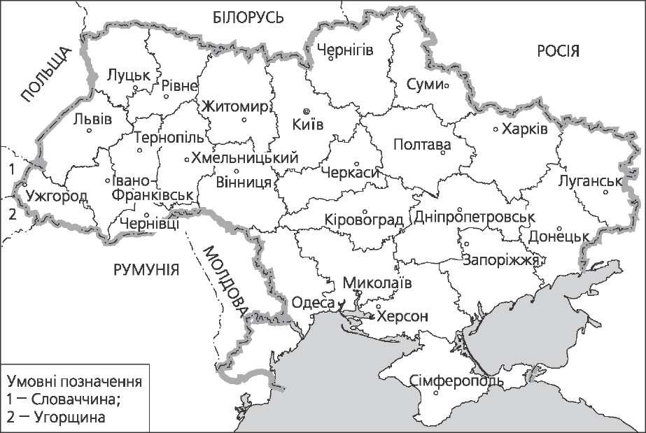 Умовні позначення сучасні державні кордони; кордон УРСР після укладання Ризького мирного договору 18.03.1921 p.; територія Молдавської АРСР, що з 12.09.1924 р. до 02.08.1940 р. перебувала у складі УРСР; територія західних областей України, возз'єднана з УРСР у вересні-листопаді 1939 p.; територія Північної Буковини і Хотинського, Акерманського та Ізмаїльського повітів Бессарабії, возз'єднана з УРСР у червні-серпні 1940 p.; територія Закарпатської України, возз'єднана з УРСР на підставі договору між Чехословаччиною і СРСР, підписаного 29.06.1945 p.; В — територія, передана Польській Народній Республіці за договором між СРСР — і ПНР про радянсько-польський кордон, підписаним 16.08.1945 p.; S- територія Кримської області, передана зі складу РРФСР до складу УРСР 19.02.1954 р. Україна являє собою унітарну державу, територія якої розділена на адмі- ністративно-територіальні одиниці. У систему адміністративно-територіального поділу входять Автономна Республіка Крим, 24 адміністративні області, Київ і Севастополь — міста державного підпорядкування. Адміністративна область — це частина території України, яка має чітко визначені кордони й систему місцевих органів державної влади та ор- ганів місцевого самоврядування. Середня площа області в Україні складає 24 тис. км2. Найбільші за площею — Одеська (33,3 тис. км2). Адміністративно-територіальний поділ України має довгий шлях розвит- ку. Знаменною віхою в його становленні стало проголошення незалежності України 24 серпня 1991 p. Історія формування території України у XX ст.  57