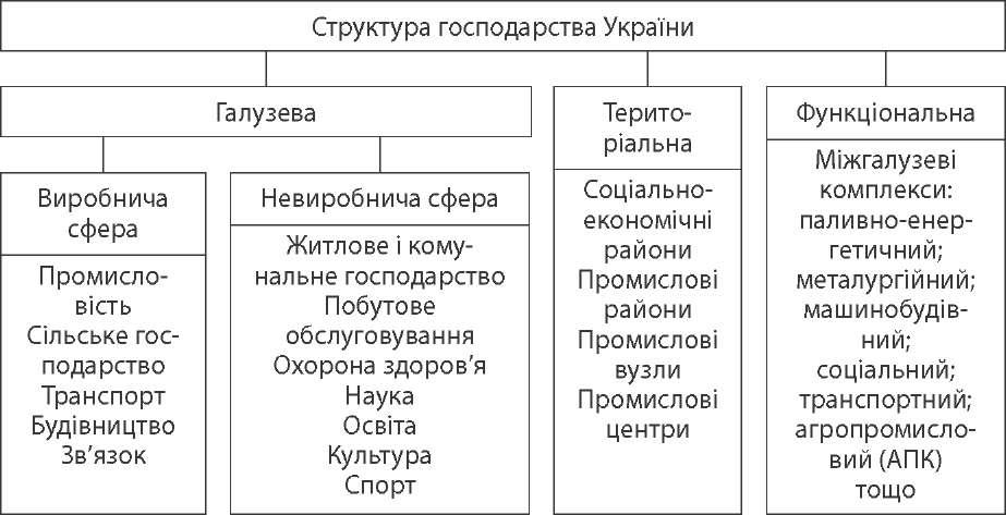 розділ ііі. господарство Загальна характеристика господарства України Економіка (господарство) — найважливіша сфера суспільного жит- тя, у якій на основі використання різноманітних ресурсів здійснюється виробництво, обмін, розподіл та споживання продуктів людської ді- яльності. Галузева структура господарства — це співвідношення і зв'язки між окремими його галузями (поділ господарства країни на окремі галузі). Га- лузь господарства — це сукупність підприємств або установ, що виробляють однорідну продукцію або надають однорідні послуги.  Народне господарство охоплює галузі матеріального виробництва — виробни- чу сферу і галузі невиробничої сфери. Головна галузь виробничої сфери — про- мисловість. Вона поділяється на гірничодобувну, що забезпечує господарство мінеральною сировиною; важку (електроенергетика, машинобудування, хі- мічна, поліграфічна і лісова галузі); легку і харчову, що виробляють предмети споживання. Важливими ланками виробничої сфери є сільське господарство, будівництво, транспорт, зв'язок. Частка зайнятих у виробничій сфері становить 70 %. До галузей невиробничої сфери належать житлове і комунальне господар- ство, побутове обслуговування, охорона здоров'я, наука, освіта, культура, спорт. Частка зайнятих у невиробничій сфері становить 30 %. За єдністю продукції, що випускається, галузі господарства поєднуються в міжгалузеві комплекси. Наприклад, ПЕК, машинобудівний, соціальний, транспортний, будівельний, АПК тощо. Підприємства кожної галузі господарства мають свою географічну адресу, свої особливості розташування. Вони розміщуються нерівномірно по терито- рії країни, концентруючись в окремих центрах, районах, областях. Таким чином, господарство країни має певну територіальну структуру — склад і співвідношення виробництв, особливості їхнього розташування в різних частинах країни та зв'язку між ними. 62