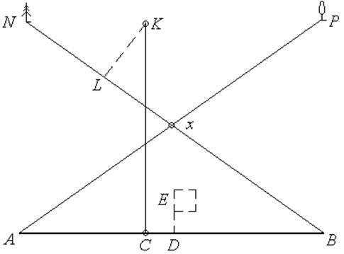 2. Для уменьшения длин промеров пользуются также пересечением прямых линий, руководствуясь тем, что точка пересечения прямых линий на аэрофотоснимке независимо от искажения этого снимка из-за его наклона всегда точно совпадает с точкой пересечения этих же прямых на местности (если искажения из-за рельефа незначительны). Поэтому при перенесении в натуру проектной точки К